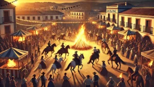 La Fiesta de San Bartolomé en Llera es una celebración animada con danzas tradicionales, una hoguera central y puestos que ofrecen comida y artesanía local.