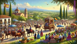 La Romería del Lunes de Pascua en Llera es una celebración vibrante que incluye una colorida procesión con personas en trajes tradicionales, carros decorados y