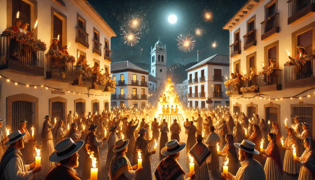 La Fiesta de Las Candelas en Llera es una celebración nocturna vibrante donde las personas sostienen velas, hay una gran hoguera y actuaciones musicales tradicionales. La atmósfera es festiva y cálida, con la luz de las velas y las expresiones de alegría en los rostros de las personas.