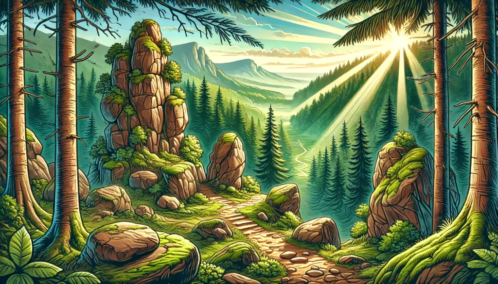 La RUTA DE LAS «MESAS» es un sendero que atraviesa un terreno escarpado con grandes formaciones rocosas. El camino serpentea a través de un bosque denso, ofreciendo vistas impresionantes de un valle desde varios miradores. Las piedras cubiertas de musgo y los rayos de sol que se filtran a través del dosel de árboles crean una atmósfera mágica y envolvente.